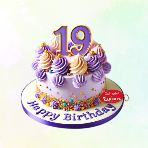 This playful purple19th Birthday Cake For Her is a colorful delight for a 19th birthday celebration! Adorned with luscious swirls of lavender and cream frosting, it features golden edible pearls and vibrant rainbow sprinkles at the base, adding a festive charm. The bold purple "19" topper, outlined in gold, stands proudly atop, while the "Happy Birthday" text elegantly circles the base.