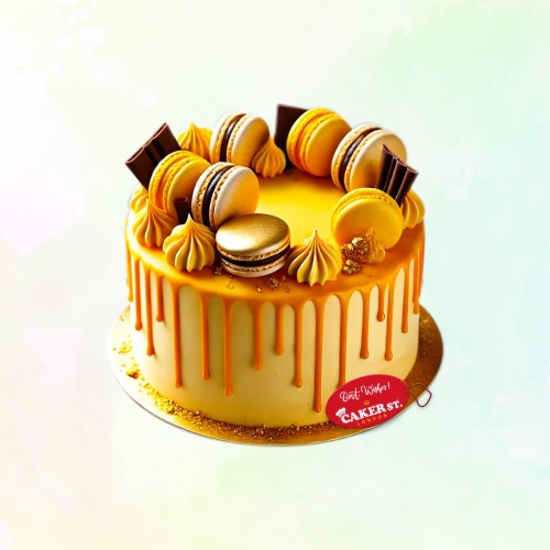 Indulge in the sophistication of our Golden Drip Cake. Adorned with a caramel drip, golden macarons, and chocolate shards, this masterpiece is enhanced with delicate golden accents. Ideal for weddings and luxurious celebrations, this cake is a golden treat to remember.