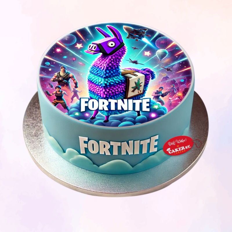 A Fortnite Cake with a blue fondant base, cloud accents, and a colorful edible image of the iconic llama and game characters, featuring the "Fortnite" logo.