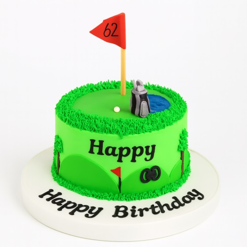This green fondant covered round shaped golf theme cake from Caker Street is completed with details on the sides in colour green and a red flag on the top.Order this Cake today, available in multiple flavors of Sponges including Vanilla, Chocolate, Red Velvet, Coffee, Butterscotch, Orange, Rainbow. For Filling, options are Vanilla, Chocolate Buttercream, Orange Buttercream, Coffee and Chocolate Buttercream Etc.