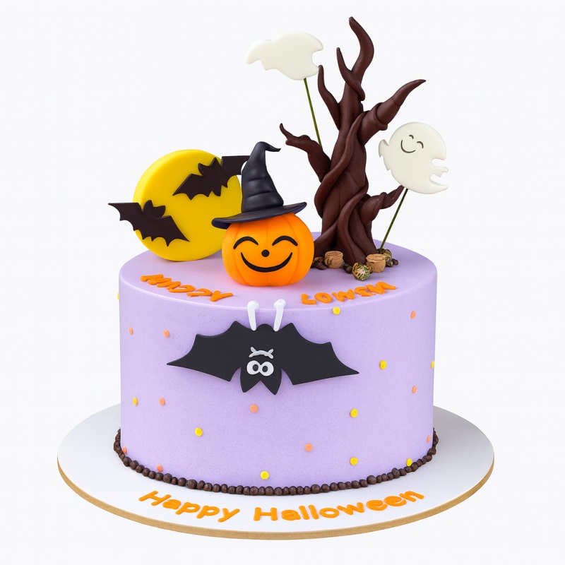 Bright, spooky, and fun! This purple Halloween cake features a smiling pumpkin witch, flying bats, ghost toppers, and a creepy tree – the perfect treat for parties and family celebrations. Freshly baked and delivered across the UK by Caker Street.