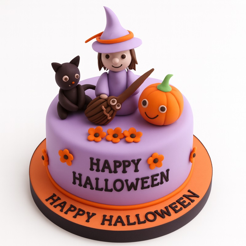 Add a magical touch to your Halloween with our Witch & Cat Cake! Decorated in purple and orange, this cake features a friendly witch, black cat, and pumpkin topper – perfect for kids’ parties and family celebrations. Freshly baked and delivered across the UK by Caker Street.