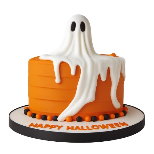 Ghost Halloween Cake Spooky yet fun! This orange cake is draped with a ghost topper and decorated with Halloween colours – perfect for kids’ parties, family gatherings, and themed events. Freshly baked and delivered across the UK by Caker Street.