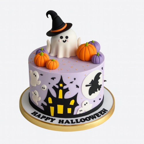 Cute Ghost Halloween Cake Add a sweet spooky touch to your party with our Cute Ghost Cake! Featuring a smiling ghost in a witch hat, mini pumpkins, haunted house, and bats, this pastel purple cake is perfect for kids’ parties and family Halloween fun. Freshly baked and delivered across the UK by Caker Street.