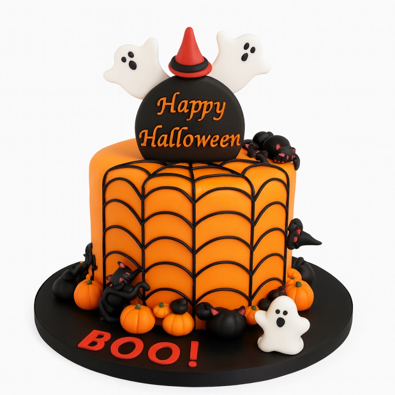 Spider Web Halloween Cake!! A creepy-cute centrepiece for your Halloween party! This bright orange cake is wrapped in a spooky spider web, topped with ghosts, pumpkins, and creepy crawlies – making it the perfect festive treat. Freshly baked and delivered across the UK by Caker Street.