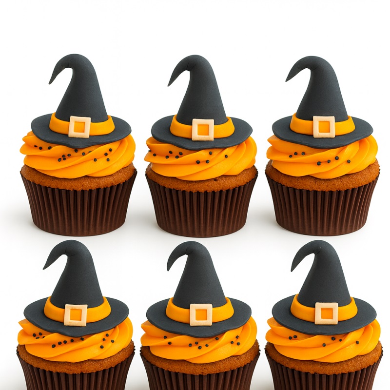 Double, double, toil and trouble—our Witch Hat Orange Frosting Halloween Cupcakes are here to enchant your Halloween! Soft and fluffy cupcakes are topped with vibrant orange buttercream, sprinkled with black edible accents, and crowned with a handcrafted fondant witch’s hat complete with a golden buckle. A striking mix of spooky and sweet, these cupcakes make the ultimate centerpiece for any Halloween party.