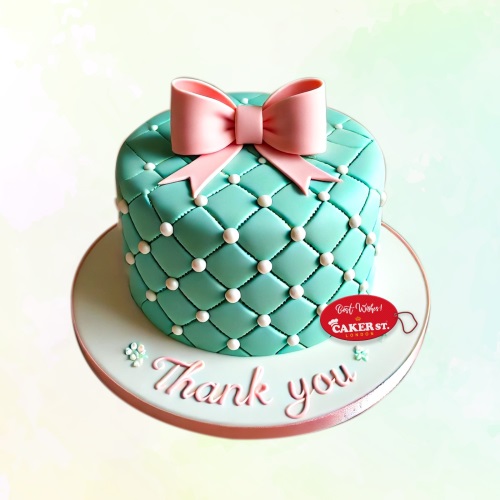 This stunning teal Thank You Cake is adorned with a quilted design, accented with edible pearls and topped with a soft pink fondant bow. Perfectly finished with "Thank You" in delicate lettering, this cake is a sophisticated way to express your gratitude with style and sweetness.