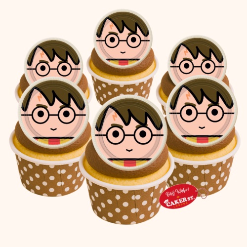 These Harry Potter-themed cupcakes feature edible toppers with a minimalist cartoon face of Harry Potter. The design includes his signature round glasses, messy hair, lightning scar, and Gryffindor scarf, set against a soft, neutral background. Each cupcake is a golden vanilla base with a smooth layer of white icing beneath the printed topper. The set is branded with a "Caker St. London" tag.