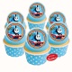 These Thomas the Tank Engine-themed cupcakes feature edible printed toppers with a colorful illustration of Thomas, set within a vibrant blue and orange border. The design highlights Thomas’s cheerful expression and classic blue train body, making it perfect for fans of the beloved character. Each cupcake has a golden vanilla base with a smooth layer of white icing beneath the printed topper. The set is branded with a "Caker St. London" tag.